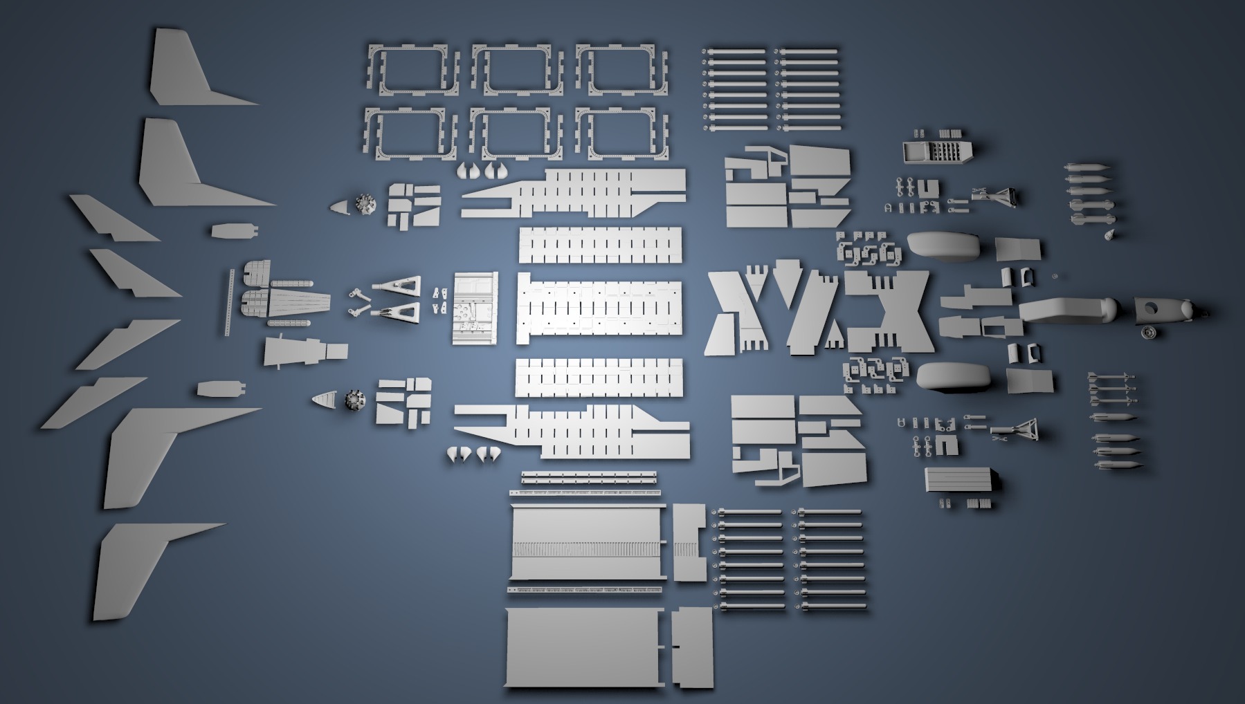 | cleaned up the ends of the 32 banshee missiles and made some small detail pieces for the tails. | Been trying to find time to rebuild the horizontal tail fins for a while. | layed out the 3D models for some of the parts I've built so far. See http://b26354.co.nz/ds_layout.jpg for full size image. If all you had was a fuselage, you'd still need all this. | machined struts for the ramp. | |