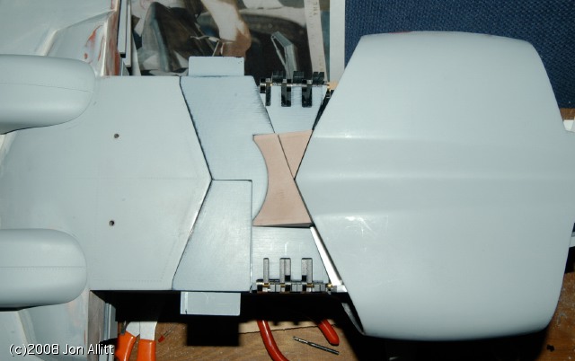 There's no going back now. Side walls epoxied and fiberglassed to the tail. One more coat of primer and it should be seamless.